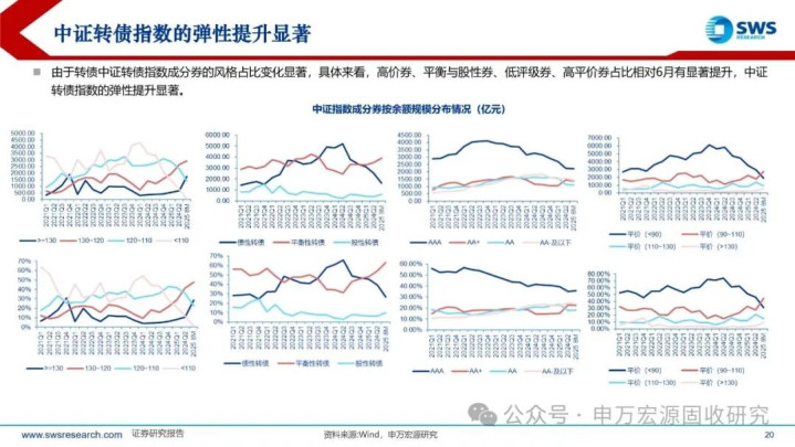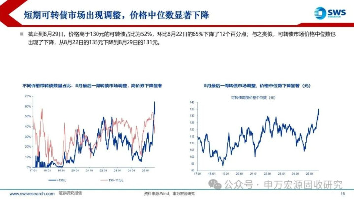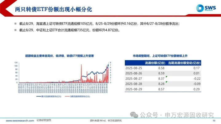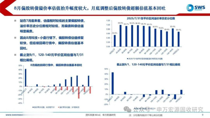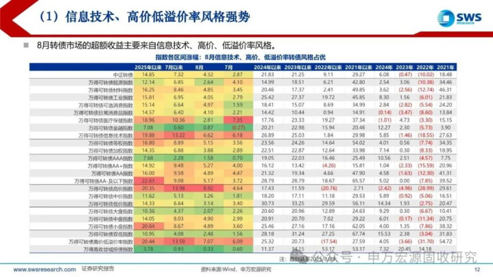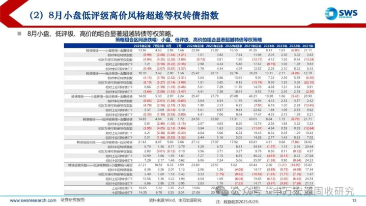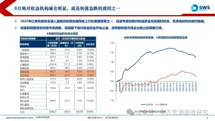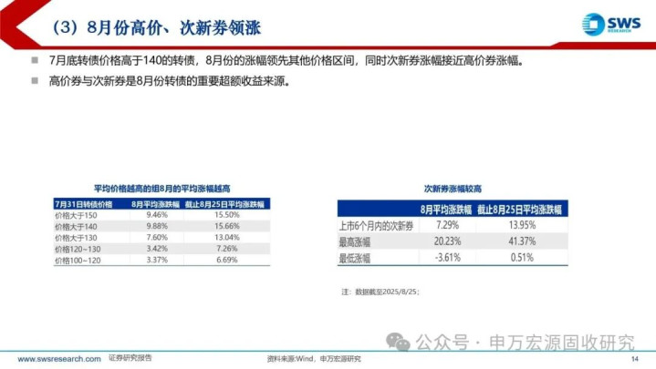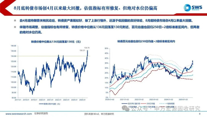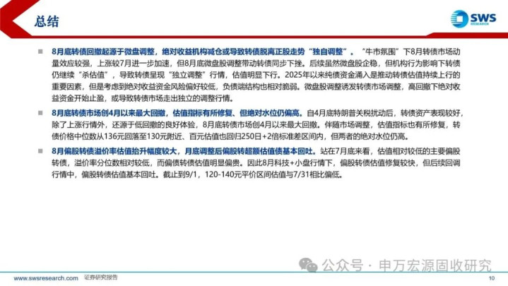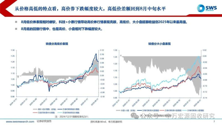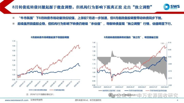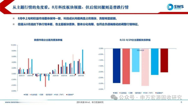 (1)“牛市氛围”下8月转债市场动量效应较强,较7月进一步加速,但8月下旬微盘股调整带动转债同步下挫。后续虽然微盘股企稳,但机构行为影响下转债仍继续“杀估值”,导致转债呈现“独立调整”行情,估值明显下行。2025年以来纯债资金涌入是推动转债估值持续上行的重要因素,但是考虑到绝对收益资金风险偏好较低,负债端结构也相对脆弱。微盘股调整诱发转债市场调整,高回撤下绝对收益资金开始止盈,或导致转债市场走出独立的调整行情。8月上中旬和权益市场整体保持一致,科技风格再度占优领涨,贡献明显超额。但是从8月底的下跌行情来看,各主题板块普跌,整体分化有限,也符合负债端推动的调整行情特征。