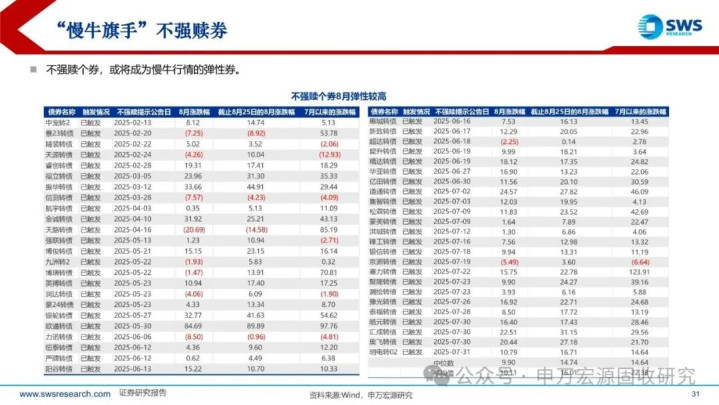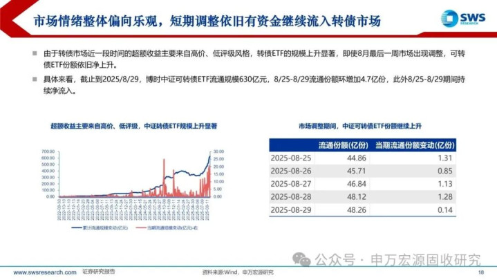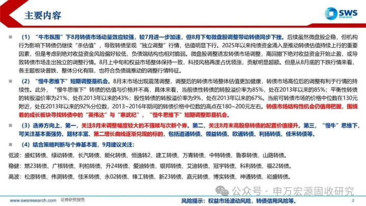 (3)选券方向上,第一,关注8月末调整幅度较大的不强赎与次新个券。第二,关注8月末高股息转债的配置价值提升。第三,“慢牛”思维下,可关注基本面强势、题材丰富、第二增长曲线逐渐兑现的标的,包括道通转债、领益转债、欧通转债、利扬转债、佳禾转债等。